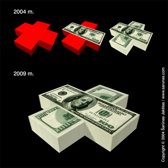 2004 metais buvo sumodeliuotas elementarus 3D raudonas kryžius, o panaudojus tikro dolerio tekstūrą, raudonas kryžius virto dolerinių kupiūrų kryžiumi, kuris paskui ir buvo karikatūros „Kardiograma“ esminis grafinis elementas.