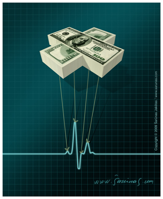 Pradžioje buvo sugalvota neįmantri karikatūra: raudono medicininio kryžiaus transformacija į dolerinį kryžių. Tik kiek vėliau ši mintis išsirutuliavo į karikatūros idėją: kryžiaus formos pinigų banknotų pluoštas (lobizmo simbolis) virvelėmis tampo (palaiko) gyvybės liniją (kardiogramos kreivę).