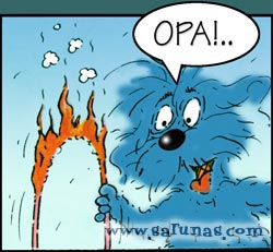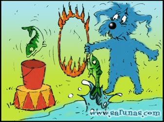 Štai čia ir yra mano žvejybiniai reikmenys, negi nesimato? pareiškė Gauriukas. Jis mikliai pastatė kibirą ant būgno, paėmė į letenėlę lanką, uždegė liepsną ir sušukęs OPA!, nukreipė lanką tarp kibiro ir upės.