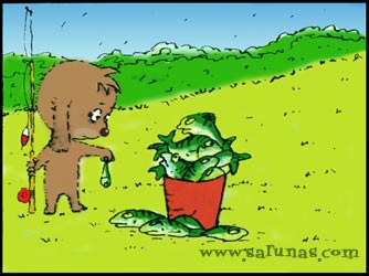 O kur žvejybos įrankiai? nustebęs pasiteiravo Mauriukas.