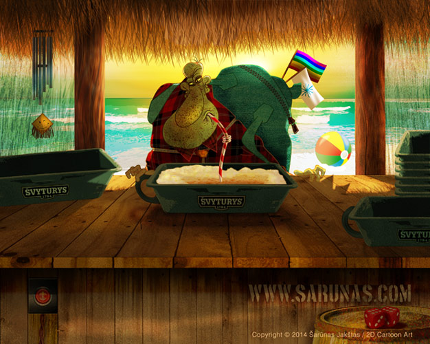 Baiginėjant spalvinti „turistą“ galvoje toliau mintys „dėliojosi“, sukosi įvairūs galimi piešinio variantai ir idėjos vystymas. Sumečiau – tai bus pilietis, pajūrio bare, šiaudeliu siurbantis alų/gėralą iš lovio.
